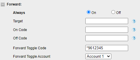 Here is an example showing the Toggle Switch where *96 is the Feature Code for enabling Call Forward and 12345 is the target number where the calls will be sent always, and the phone will perform a silent call to the PBX.