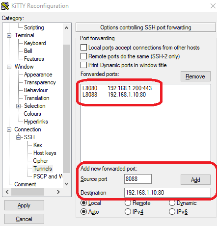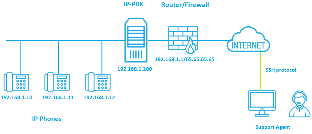 So, according to the diagram, we will establish an SSH connection to IP 65.65.65.65 on port 22. Once the connection is established, let’s say we need to connect to the IP-PBX WebGUI on port 443 and to a phone’s Web GUI with internal IP Address 192.168.1.10.
