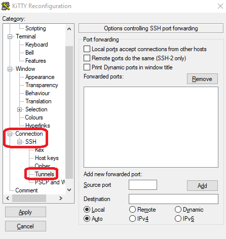In ‘Destination’ enter the internal IP address and the port you want to connect to.