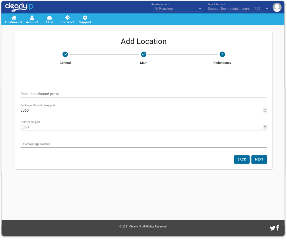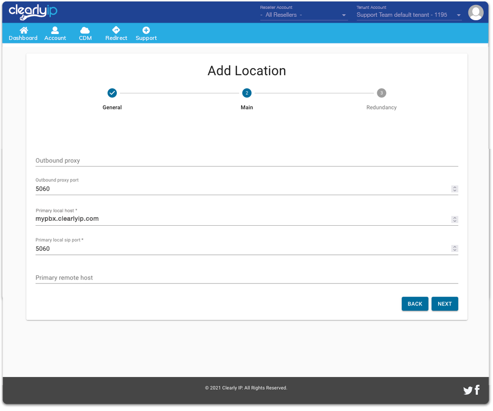 Administrators create the location for the customer or PBX with outbound proxy and primary host information. Set up of redundancy, codec and feature codes are easily accessible from a tabbed interface.