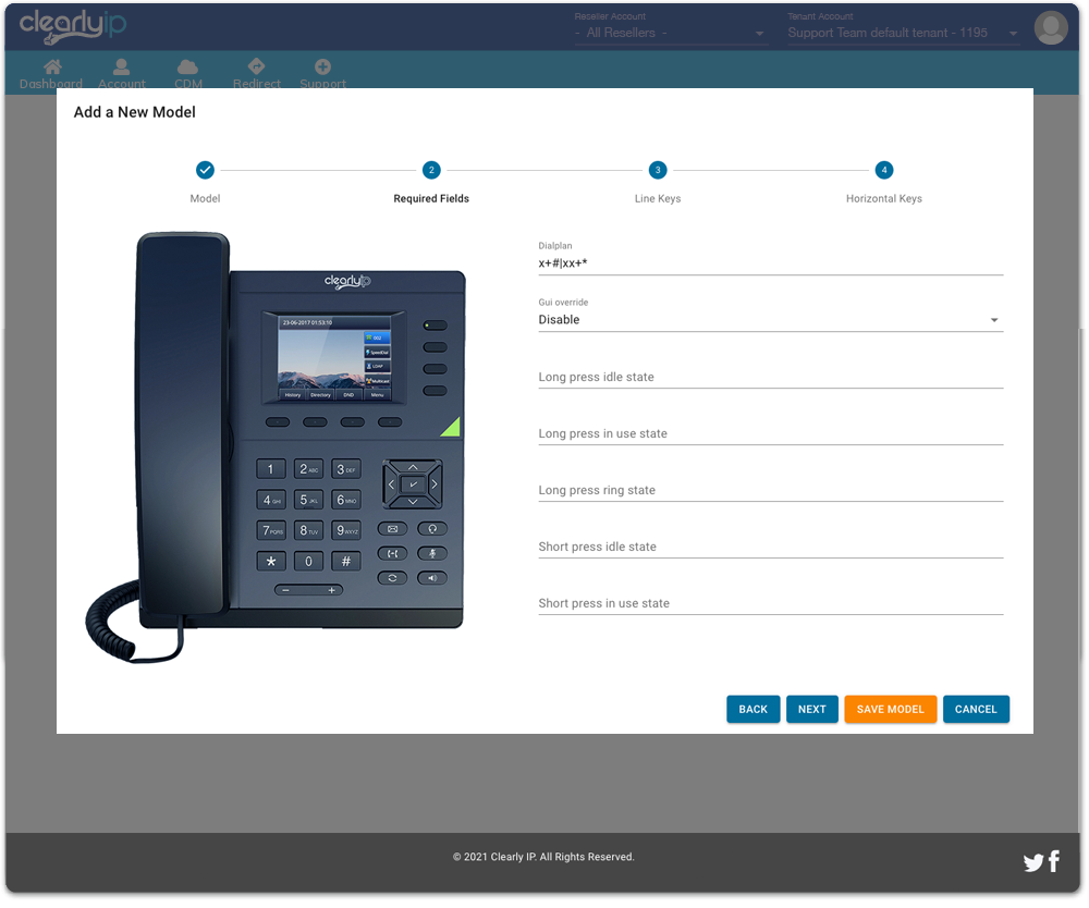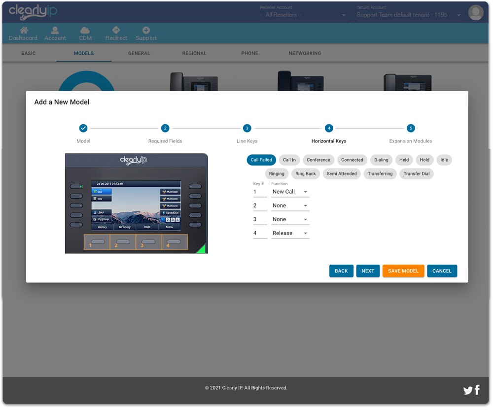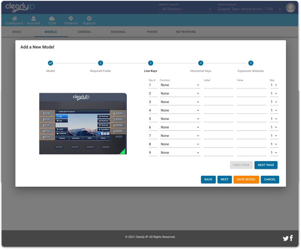 Select the manufacturer and phone model. A key benefit of CDM is that you can have multiple model layouts for the same template. A provisioning wizard will walk you through different key functionalities that can be programmed, see the workflow below.